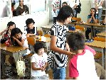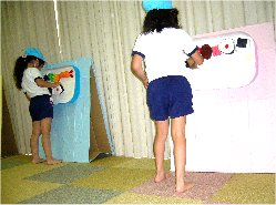 恵我幼稚園 ぞう・きりん組 合同保育 「つたえて、できたよ」 授業者 藤定マサミ 阪本 真保子 今回の幼稚園のあいあいタイムは5歳児の合同保育です。授業は「伝言ゲーム」です。手遊び「これくらいのおべんとうばこ」から始まり、2人組・3人組とグループが増えていきます。2人組では「パンやさんでおかいもの」、3人組では「あらってあらって」、4人組では「なべなべ底ぬけ」そして最後に6人組になり「伝言ゲーム」のはじまりです。先頭の人から順番に決められた言葉をうしろの人に伝えていきます。さあ、正しく伝わるのでしょうか。1回目、なんど「どうぶつえん」が出来上がりました。さあ、2回目に挑戦、はたして、何ができあがるのでしょう。どうやら「おべんとうばこ」のようですね。 指導案 |