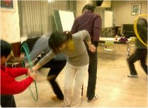 | 前回に引き続き、ちょんせいこさんのファシリテーション講座です。夜の開催なので、校区の教員の中にはなかなか参加しづらい方も多いのですが、早朝からお子さんの夕食を準備して晩にのぞんでいただきた先生もおられました。今回は、教室の中の風通しを良くするということで、トランプやフラフープを使って、ペアワークからグループワークに広げていく手法。もう一つはちょんさんの18番、会議ファシリテーションの展開でした。今回の会議ファシリテーションは、ペアで聴きあうということをメインに行ってくれました。聴いてもらうことを通じて、一人ひとりの思考が論理的に整理されていくプロセスを体験し、参加者全員、聴いてもらった感と自分で整理できたかな感を味わわせていただいた時間になりました。(F) | ![]() ![]() ![]() |