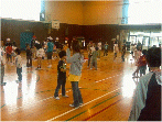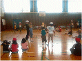 体育館の中を所せましと走り回ります 6年生が1年生をしっかりとリードしています |