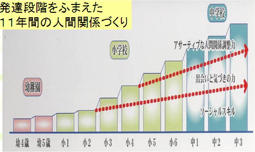 しかし、一般的にはソーシャルスキルを土台として、「出会い」と「気づき」の力や人間関係調整力や人間力が育成されていくというふうに理解されています。当然、この考え方に松原七中校区の人間関係学科も立脚しているのですが、本当はソーシャルスキルとう概念の中に「出会い」と「気づき」の力、人間関係調整力+人間力というものが含まれていると理解するほうが、正しい理解だと思います。つまり、整理する意味合いで、ソーシャルスキルを土台として「出会い」と「気づき」の力、人間関係調整力+人間力を積み上げていくという理解をしますが、それぞれの間の線引きというものがないということなのです。