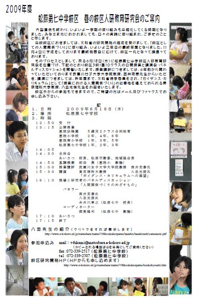 | 2009年6月18日(木)、校区人権教育研究会を開催いたしました。テーマは、「11年間の人間関係づくり」、その中でも「ガイダンス・カリキュラムへの展望」ということで、人間関係づくりの授業をこれからどうめざしていくか、というものでした。幼稚園から中学校までの11クラスの公開授業と、西井克泰氏(武庫川女子大学大学院)の授業講評と八並光俊氏(東京理科大学教授、前文科省視学委員、日本生徒指導学会事務局長)からのご講演をいただきました。校区外からも多くの方々が参加して頂き、たいへん実のある取組となりました。 |