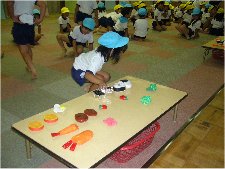 恵我幼稚園 ぞう・きりん組 合同保育 「つたえて、できたよ」 授業者 藤定マサミ 阪本 真保子 今回の幼稚園のあいあいタイムは5歳児の合同保育です。授業は「伝言ゲーム」です。手遊び「これくらいのおべんとうばこ」から始まり、2人組・3人組とグループが増えていきます。2人組では「パンやさんでおかいもの」、3人組では「あらってあらって」、4人組では「なべなべ底ぬけ」そして最後に6人組になり「伝言ゲーム」のはじまりです。先頭の人から順番に決められた言葉をうしろの人に伝えていきます。さあ、正しく伝わるのでしょうか。1回目、なんど「どうぶつえん」が出来上がりました。さあ、2回目に挑戦、はたして、何ができあがるのでしょう。どうやら「おべんとうばこ」のようですね。 指導案 |