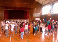 「ジャンふえ」 ジャンケンでなかまをふやす 6年生が赤白帽をかぶる 1年生をつれて「オニ」(赤帽)ペアが白帽ペアにタッチします 1年生どうしがジャンケンします 白帽が負けると赤帽の仲間になります |