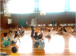 体育館の中を所せましと走り回ります 6年生が1年生をしっかりとリードしています |