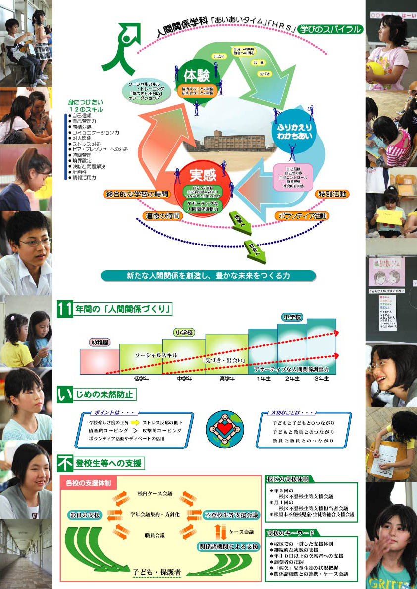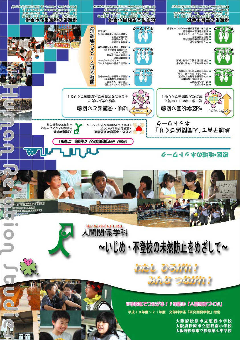 | 松原市立恵我小学校、松原市立恵我南小学校、松原市立松原第七中学校では、2007年度から2009年度にかけて、校区で文科省研究開発学校の取組を行ってまいりました。「学校が楽しくなればストレスが減る。ストレスが減れば不登校やいじめが減る。」というフレーズを合い言葉に、不登校生等への支援と、いじめ・不登校等の未然防止のための授業づくり(人間関係学科−中学校:略称HRS、小学校:あいあいタイム)に取り組んできました。 現在校区では恵我幼稚園も含め、3校1園で、11年間の「人間関係づくり」のためのプログラムづくりに励んでいます。ソーシャルスキルトレーニング・「出会いと気づき」の学習・アサーティブな人間関係調整力を育てる学習という11年間の流れを通じて、遊びから始まり、ストレスマネジメントやアサーショントレーニングを取り入れた「楽しみながら」人間関係づくりを学べるプログラムを展開しているところです。 研究開発の期間が終了しましても、引き続き取り組んで参ります。学校訪問、出張ファシリテーションともに受け付けております。不登校生等への支援、人間関係づくりの授業づくりの授業の充実と拡がりのために、ネットワークをさらに拡げていきたいと思っております。 |
