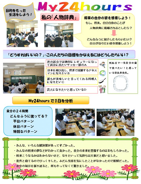 他者へのアドバイスから始まる。他者に対しては不思議と客観的になれるのが人間である。何人かの登場人物の夢やしたいことに対して「どうすればいいか」を考えることから始まる。次に、「人物辞典を作ろう」というテーマで、自分の将来について考える。自分の半生が人物辞典に載るとしたらどのように書かれたいかという形で考えれば、これも自分を他者として見立てることで、不思議と想像しやすくなるのだ。そして、最後にMy24hoursワークシートで自分自身に迫っていく。他者からの客観的な見方を、無理なく自分自身に導入していく手法である。