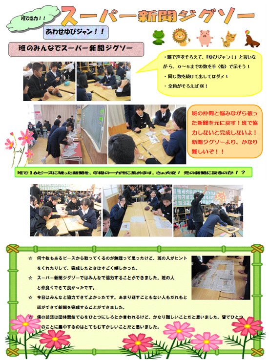 【ダウンロードできるもの】 支援プラン、 掲示物、 ふりかえり用紙、 1.「新聞ジグソー」支援プラン 2.カードでドン 3種 3.カードでドン 5種 【ねらい】 協力 学級や班での「協力」がテーマである。「協力」は、まわり(相手)の気持ちを考えながら自分の行動を決めていくものである。「相手の気持ちを想像しながら自分の主張をしていく」アサーションを駆使できる場である。『新聞ジグソー』(次々頁に掲載)をクオリティーアップした活動を通じて協力する力を育てていく。 【概要】 『ゆびジャン』で気持ちをひとつにするウォーミングアップを行った後、『スーパー新聞ジグソー』に入っていく。『新聞ジグソー』は、班の中で破った新聞を元に戻すという作業であるが、この授業では、各班が破ったピースを学級の一カ所に集め、これを元の形にする。一見、不可能に思える作業であるが、時間が経過するにつれて、各班の新聞が元に戻っていくのである。自分の班以外のピースを持って帰ると他の班に迷惑がかかってしまう。終わってみると、この授業は競争ではなくて学級全員や班の仲間の協力で成り立っていることに気づくのである。の大切さと双方向のコミュニケーションの有用性に気づいていく。 【ポイント】 『新聞ジグソー』自体は、雑に破いたほうが位置を特定しやすくなるので元に戻しやすい。しかし、そうなると達成感を得るチャンスが奪われるだけでなく、教室の雰囲気が乱れてしまう可能性がある。学びや気づきの場をしっかりとつくるためにも、きっちりと丁寧に破ってもらったほうがよい。そのために、破る人に全員立ってもらって、ひとりで破るという作業を、16ピースになるまで4回くり返す。 【子どもの気づき】 ・スーパー新聞ジグゾーではみんなで協力することができました。班の人と仲良くできて良かったです。 ・何十枚もあるピースから取ってくるのが無理って思ったけど、班の人がヒントをくれたりして、完成したときはすごく嬉しかった。 ・今日はみんなと協力できてよかったです。あまり話すこともない人もだれもと話ができて新聞を完成することができました。 【教員からのコメント】 ・わたし自身も、こんな作業を子どもができるのかと感じていました。しかし、模擬授業で実際自分自身が取り組んでみると、グループの人に助けてもらったり、同じ新聞を見ていても人によって覚えている場所が様々でした。自分としては自信がなかったのですが、「こういう記事を取ってきてね。」って教えてもらったことが助けになりました。教師ながら完成したときは嬉しかったです。 |